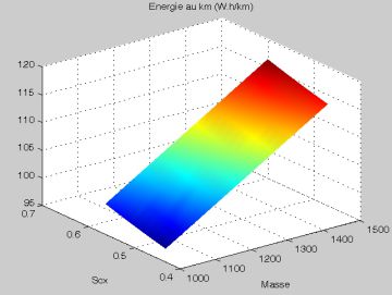 Les simulations sont basées sur une Renault ZOE en cycle de vitesse NECD, ayant une autonomie de 210 km (masse =1472kg avec conducteur). Pour chaque comparaison, 10 masses et 10 SCx (rep.RRC ou rendements) sont testés, soit 100 simulations, avec un même modèle de véhicule.